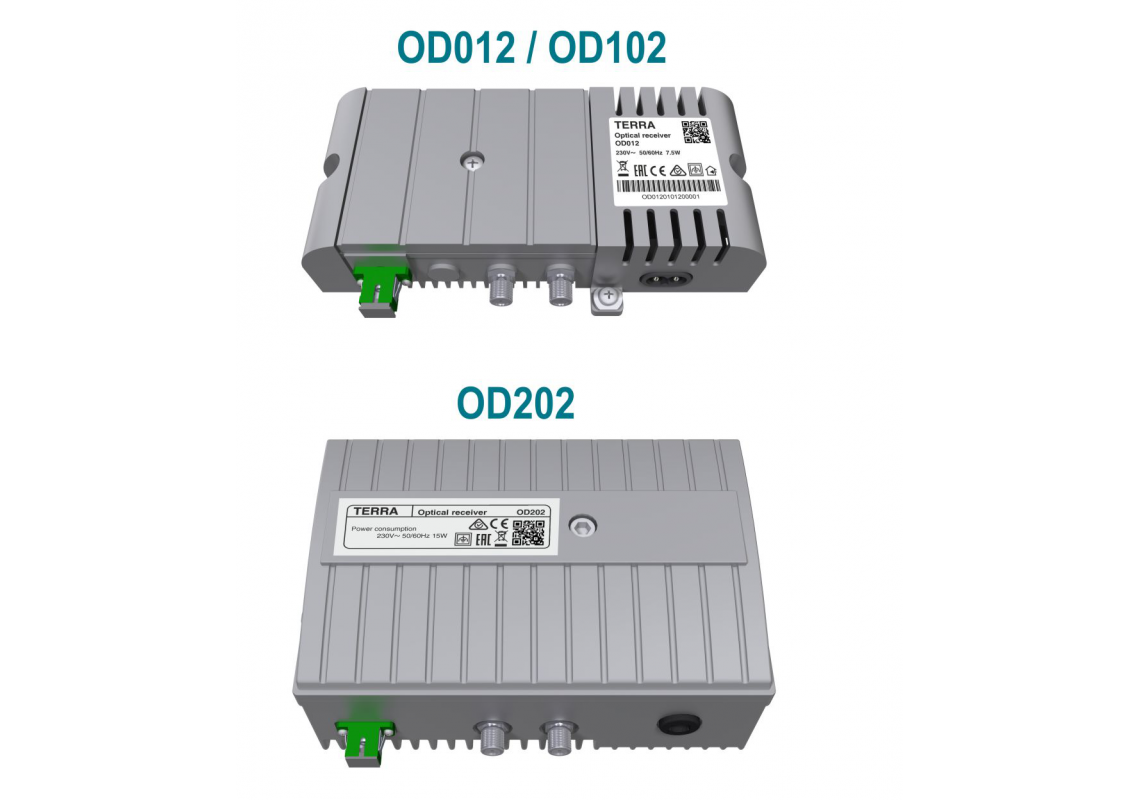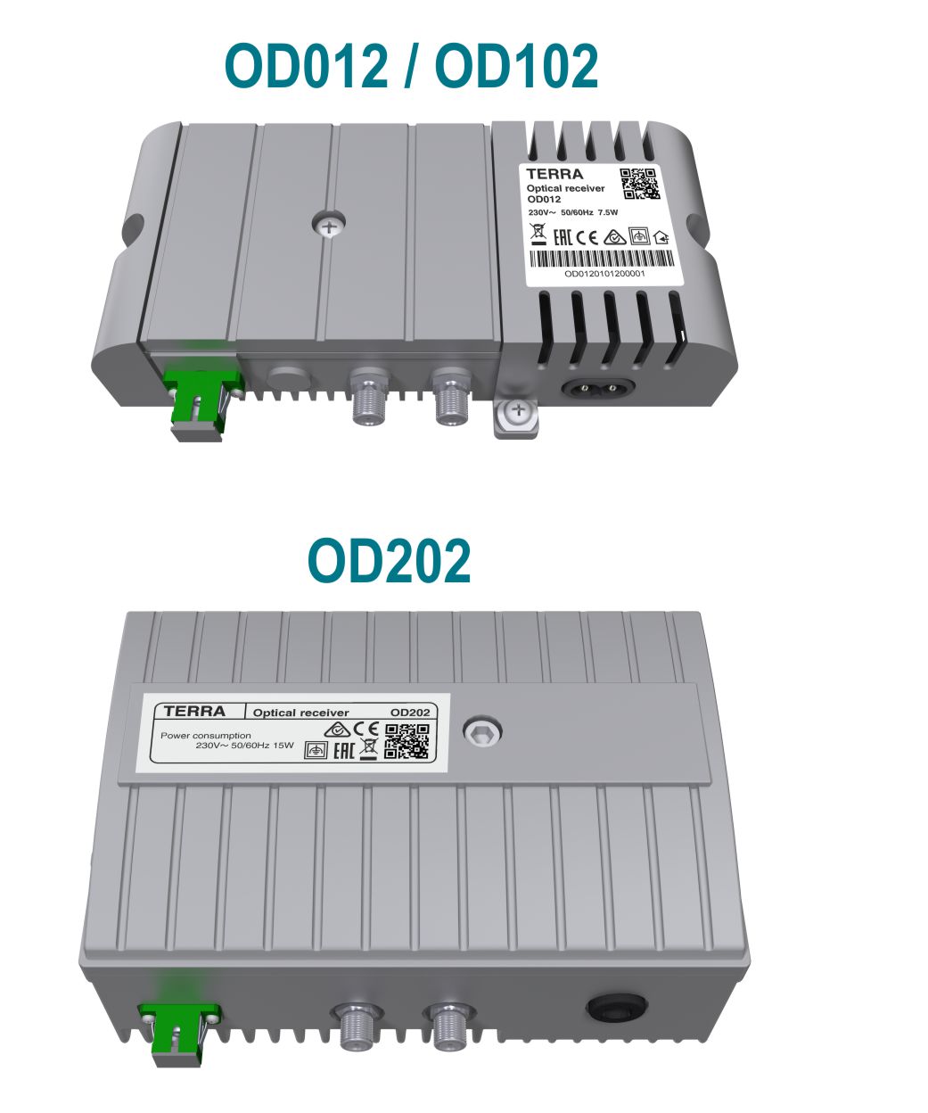 OD012, OD102, OD202 - high output level optical receivers are intended to convert optical signals into electrical signals for further distribution in cable TV networks. Devices are equipped with AGC based on optical input level.