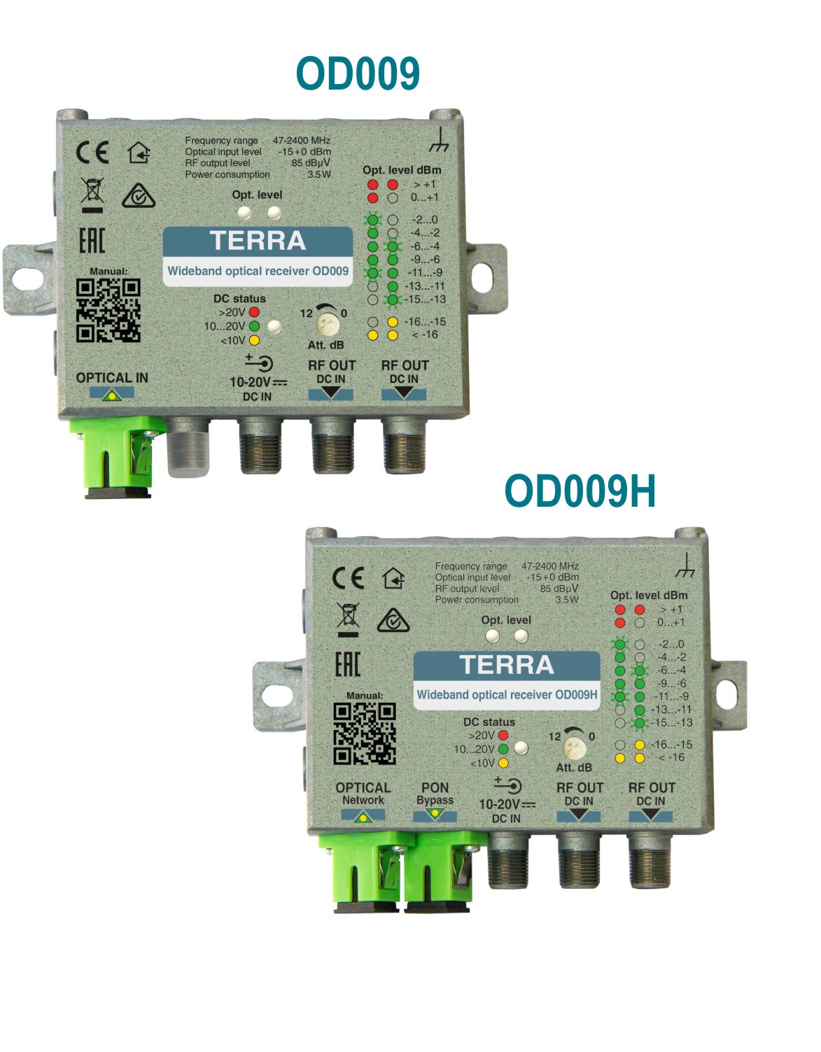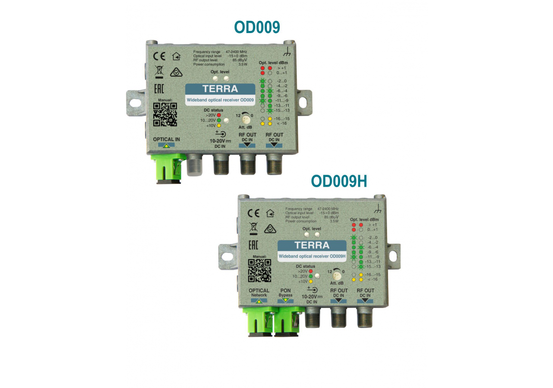 OD009- optical receiver is intended to convert SAT IF, digital CATV and DTT signals from optical to electrical. Device is equipped with AGC based on optical input level.