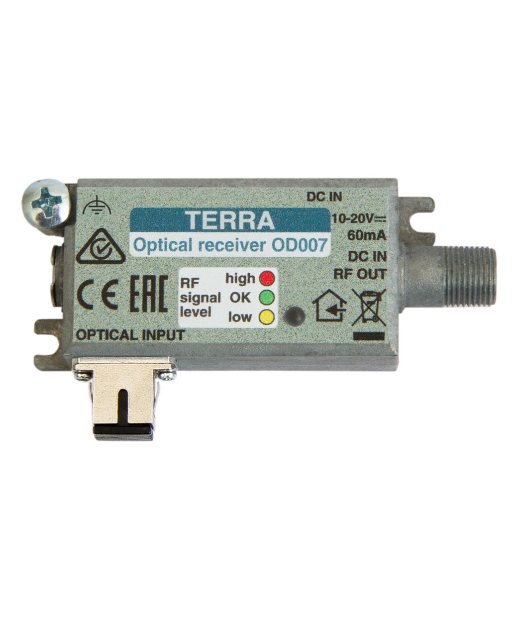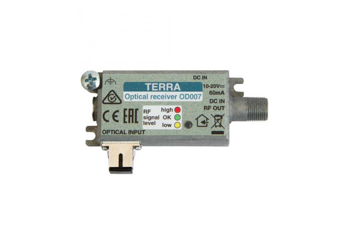 OD007 main features: • compact optical receiver of SAT and DTT signals • AGC based on RF signal output level • LED indication of RF signal level • robust die-cast housing