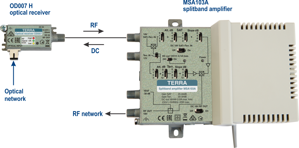 Ultra wideband 47-2400 MHz mini optical receiver OD007 with SC/APC input connector is a new recover in TERRA products range. The OD007 receiver has automatic gain control (AGC) system for keeping RF output level constant. AGC range of optical input power is from 0 to -15 dBm. The receiver could be powered via RF output or via DC IN connector. Application diagram shows using of receiver OD007 with splitband amplifier MSA103A. The receiver is powered from the amplifier. Separated gain and slope adjustments of MSA103A allows to set independently optimal output levels for satellite and terrestrial TV carriers.